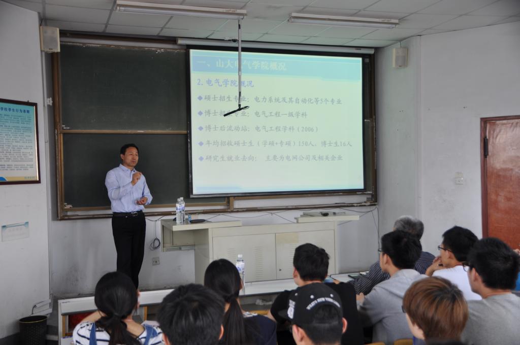 报告会上,高教授从山东大学电气工程学院概况、继电保护专业特点、继电保护科研简介和个人体会与展望四个板块做了详细介绍;过程中,结合自身多年教学与科研工作的经验,旁征博引地阐述了继电保护专业特点,并就继电保护研究对象,配套实验室建设,以及山东大学继电保护研究所的建立历史、科研成果、研究方向做了详细阐述。在体会和展望环节就自身多年科研心得、本科和研究生的科研定位、山东大学电气学院研究生招考情况与师生进行了互动交流,高教授精辟独到的见解赢得了现场阵阵掌声与好评。