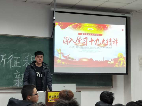自化176班团支书王自恒,向同学们讲解了前段时间团支书学习会中的思想,并嘱咐同学们期末临近,要注重学习。在播放完十九大相关视频后,自化173的团支书张晋晖,回顾了视频,并讲解了十九大的四新,即中国特色社会主义进入了新时代,这是我国发展新的历史方位,而我国社会主要矛盾已经转化为人民日益增长的美好生活需要和不平衡不充分的发展之间的矛盾,在此形式下形成了习近平新时代中国特色社会主义思想,而我们要实现的目标是在本世纪中叶建成富强民主文明和谐美丽的社会主义现代化强国