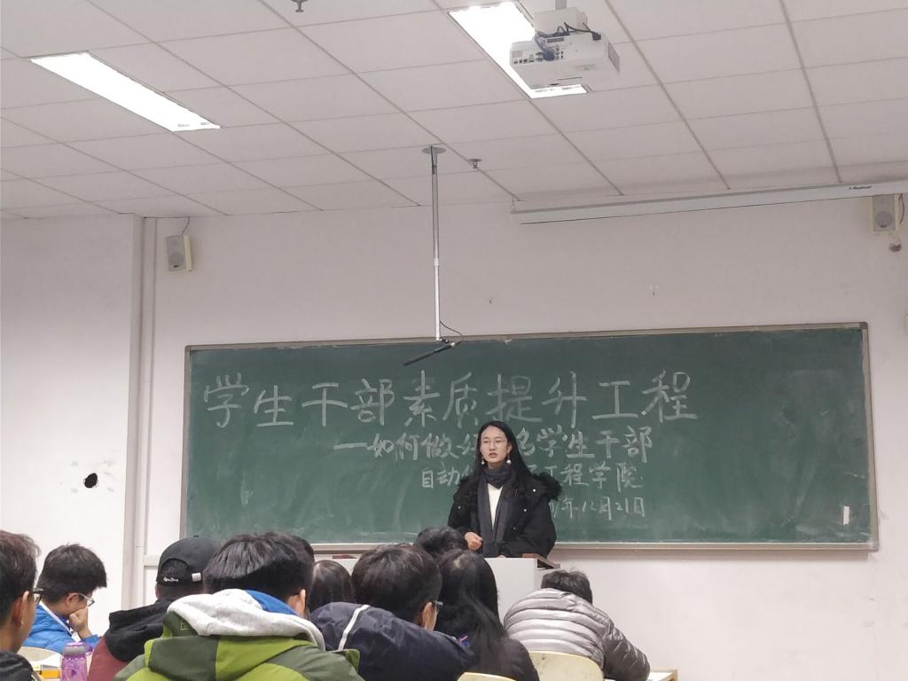 测控171班的班长丁绥牧和团支书铁雅雯在会议上总结了他们在班级管理方面的失误教训。他们说,身为员工干部,要时刻保持清醒的头脑,尤其是对待班里员工的各种问题上,要有足够的重视程度。电气3+4 171班的杨文佳同学向大家分享了旁听测控171班班会时刘海波老师在大学时期担任班长的心得体会:一是员工干部要有魄力,在工作中不断思考,在思考中不断完善;二是员工干部要起到模范带头作用,即火车跑得快,全靠车头带;三是员工干部要慎独,做到群处守住嘴,独处守住心。相信这三点会对员工干部们有着很大的帮助。