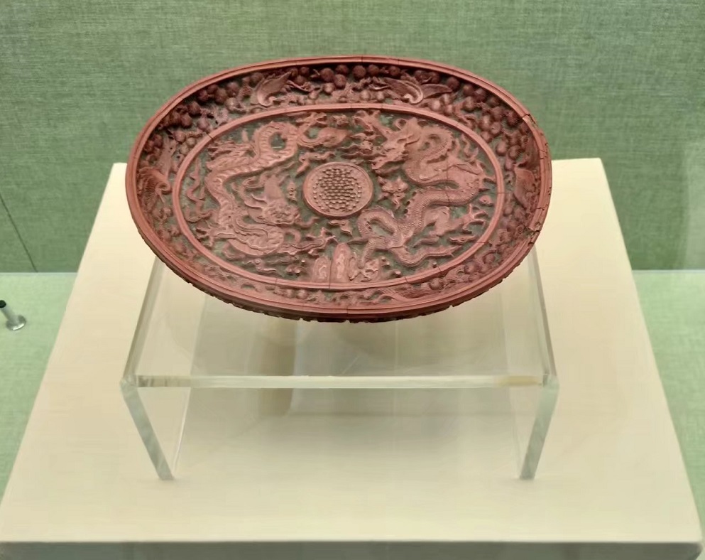 工艺品展区,陈列着各种漆器、玉器、香炉、拉丝法郎、象牙雕、犀角透雕、木雕、文房四宝、唐三彩等等,精彩绝伦,无与伦比。李汝宽先生捐赠的剔红双龙戏珠盘镇馆,此物世界仅有的三件,中国据其一。