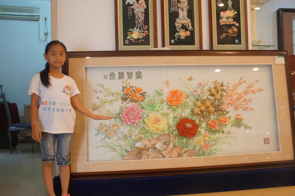 在现场,孩子们在解说员和老师的带领下,一个展厅一个展厅地参观。参观中,解说员详细讲解每件贝雕艺术品的背景、来源和意义,加深了孩子们对贝雕文化的了解,激发了他们的好奇心和求知欲。其中有位工艺师正在现场雕刻贝雕作品,一个个厚厚的贝壳,在她灵巧的手中被雕琢成了轻薄如纸、几可乱真的牡丹花瓣。孩子们在旁边跃跃欲试,但又小心翼翼生怕碰坏了这些精美的艺术作品。他们不时地向解说员咨询贝雕艺术及博物馆展品的相关问题,合理的运用义卖筹得的资金,解决了本次出行的全部费用。